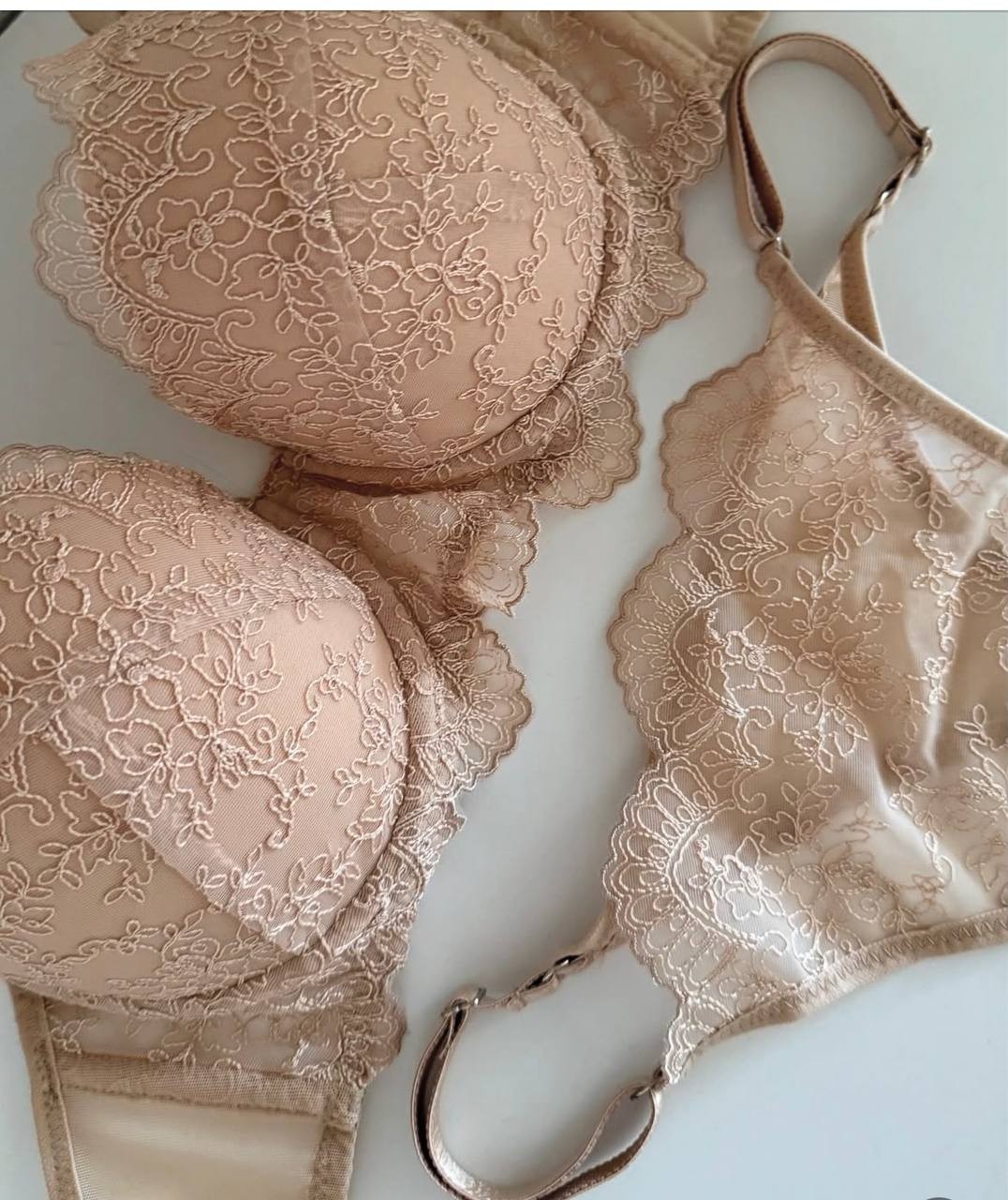 Комплект, у який закохуєшся з першого погляду Чашка push-up +1,5 розміру — це не просто білизна, це магія форм. Вишукана вишита сіточка в ніжному бежево-золотому відтінку виглядає на тілі неймовірно делікатно та спокусливо. Цей комплект підкреслює природну красу, додає впевненості й створює бездоганний силует. Легкість, комфорт і розкіш у кожній деталі