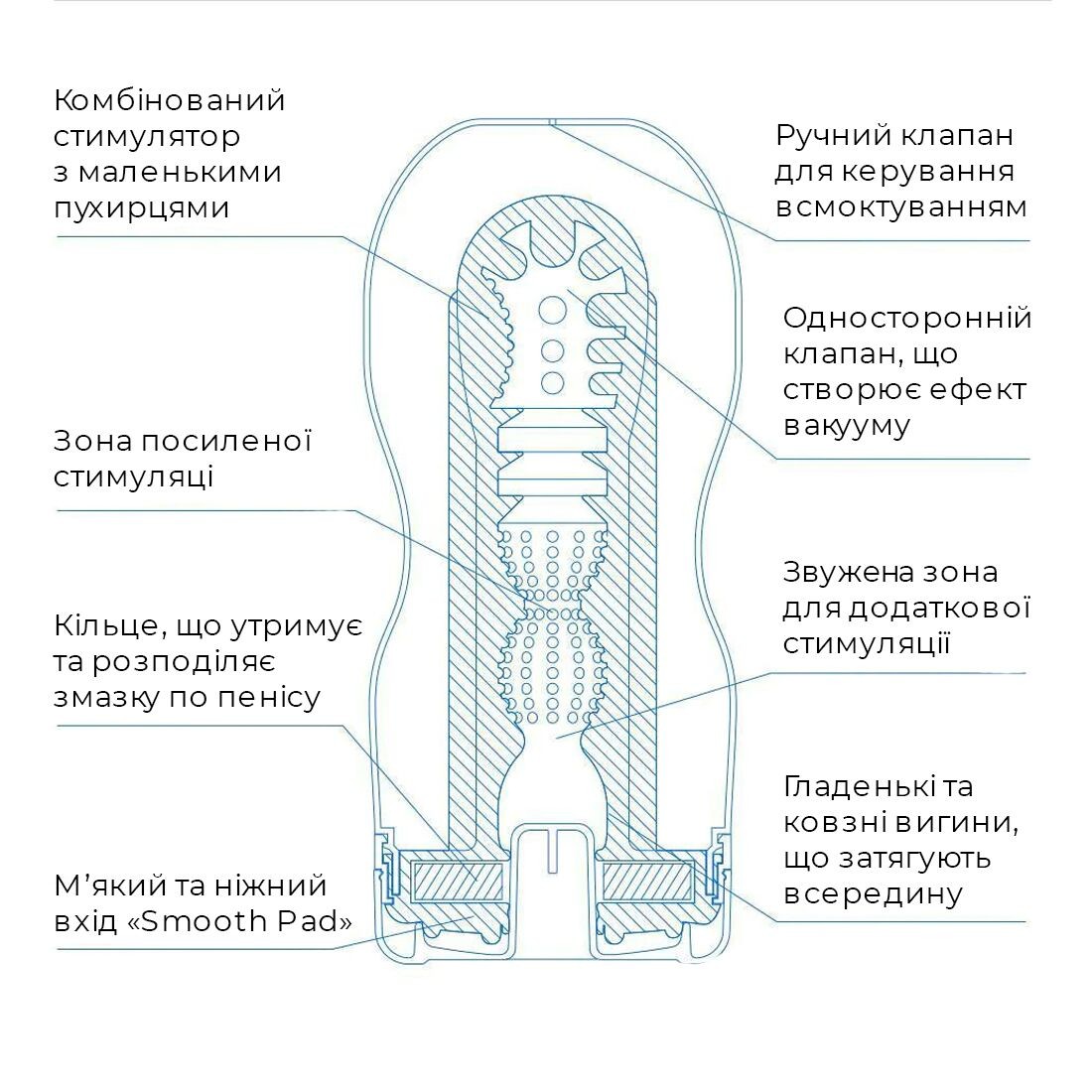 Глибина - 15 см. Ширина - 4,5 см. Ефект вакууму - регульований. Охолоджувальний ефект - так. Вбудована змазка - так. Спеціальний очисник для догляду при повторному використанні.